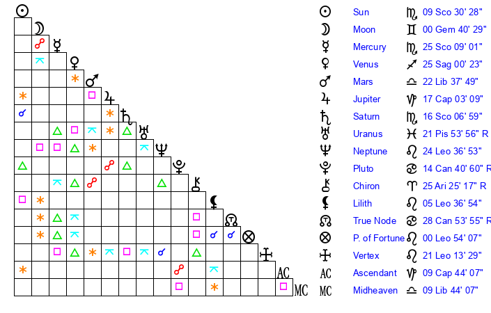 | Moon | 0 Gemini 40 | 27 Pisces 17 | 19 Capricorn 9 |