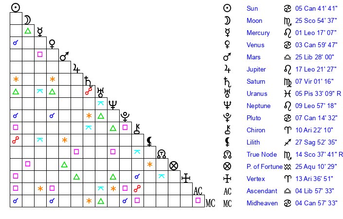 | Moon | 25 Scorpio 54 | 6 Leo 16 | 0 Libra 35 |