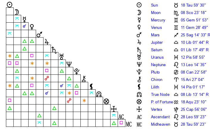 | Moon | 8 Scorpio 27 | 25 Libra 31 | 7 Leo 59 |