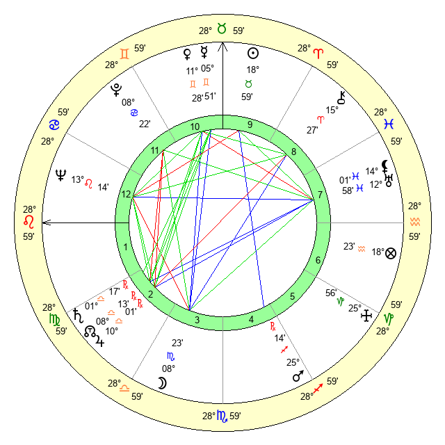 | Jupiter | 9 Libra 43 | 23 Gemini 19 | 16 Libra 14 |