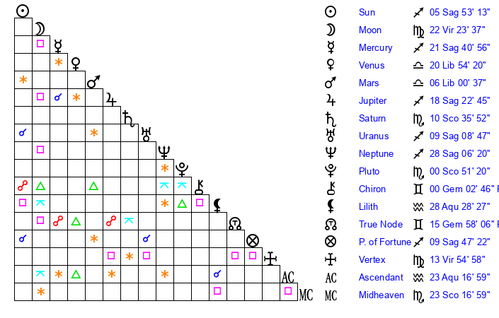 | Sun | 5 Sagittarius 54 | 6 Sagittarius 43 | 18 Capricorn 37 |