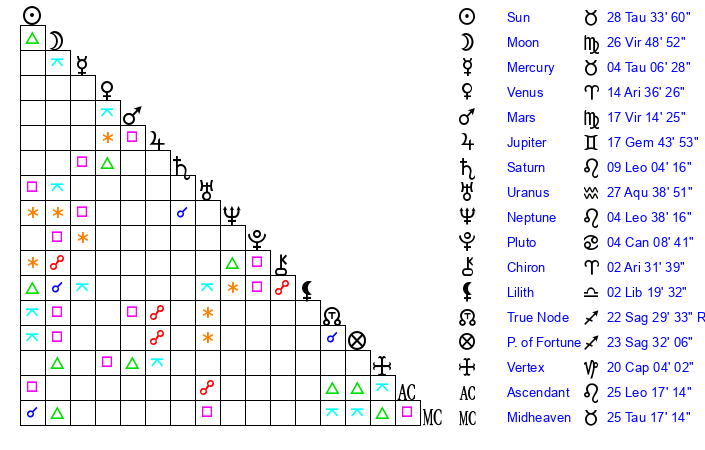 | Sun | 28 Taurus 34 | 29 Taurus 39 | 11 Virgo 3 |