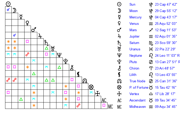 | Venus | 25 Aquarius 52 | 11 Pisces 52 | 16 Pisces 35 |
