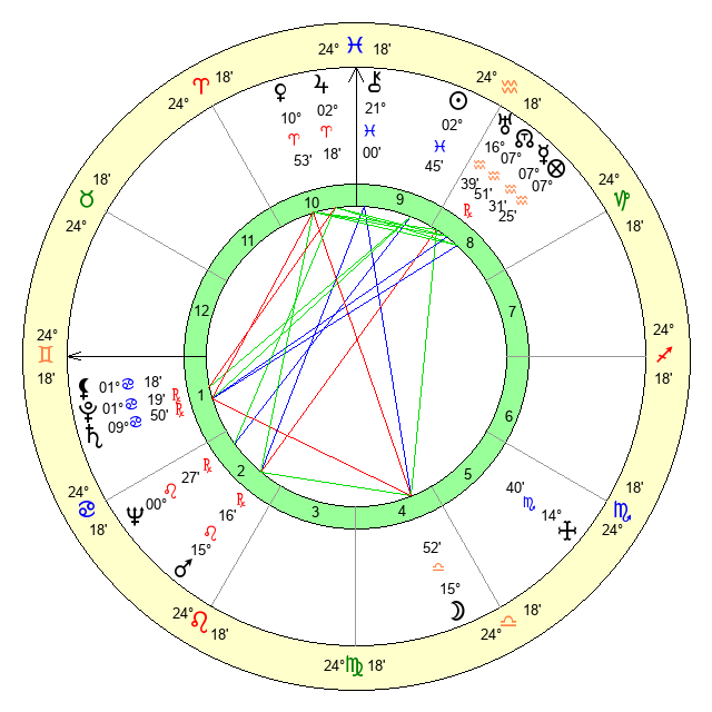 | Sun | 2 Pisces 45 | 4 Pisces 19 | 19 Gemini 26 |