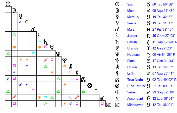 | Venus | 19 Taurus 12 | 26 Pisces 2 | 12 Virgo 42 |