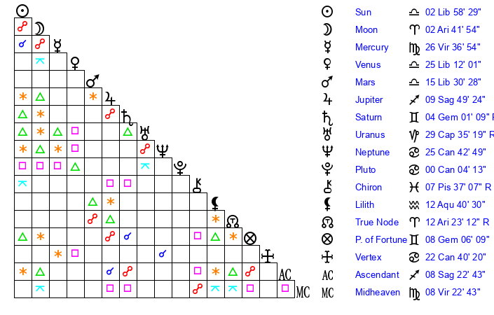 Sun | 2 Libra 59 | 3 Libra 37 | 26 Capricorn 45 |