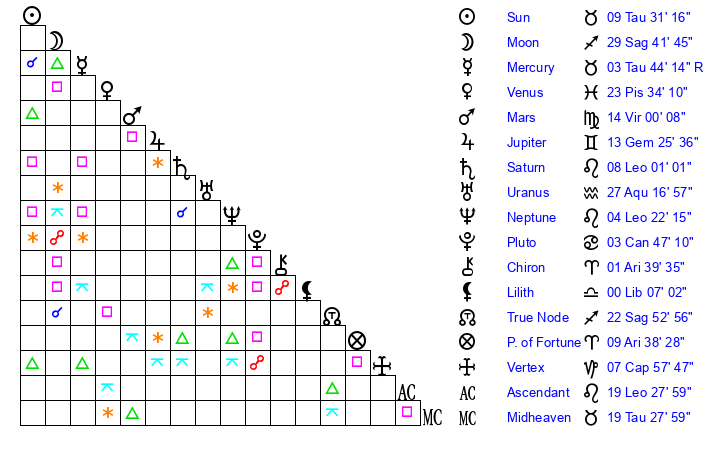 | Moon | 29 Sagittarius 43 | 21 Gemini 21 | 0 Sagittarius 17 |