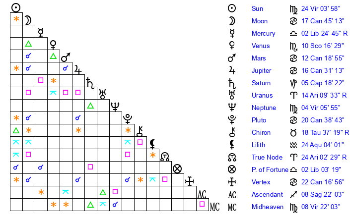 | Sun | 24 Virgo 4 | 25 Virgo 3 | 29 Sagittarius 7 |