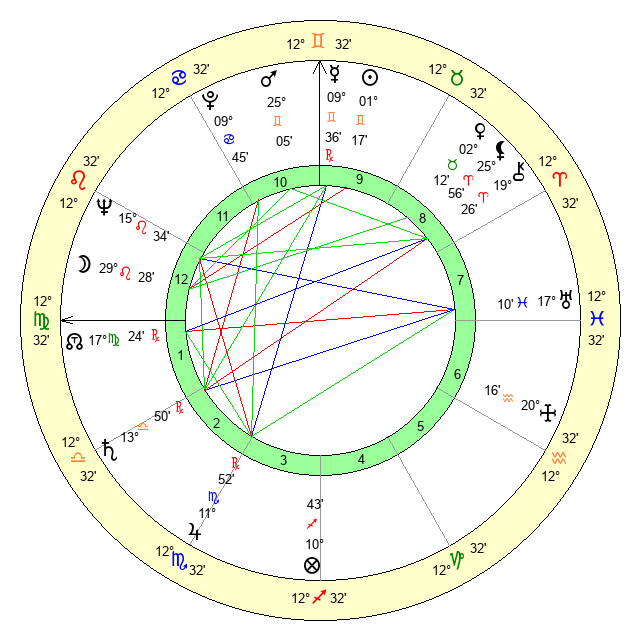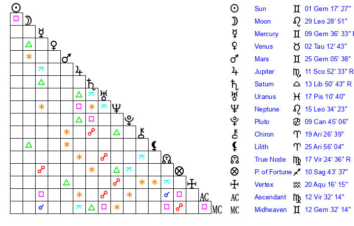 | Sun | 1 Gemini 17 | 2 Gemini 34 | 8 Virgo 57 |