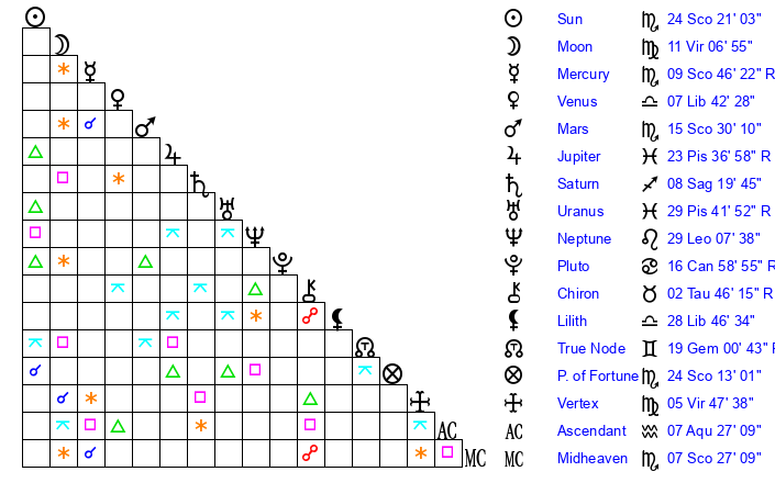 | Sun | 24 Scorpio 21 | 25 Scorpio 50 | 2 Pisces 51 |