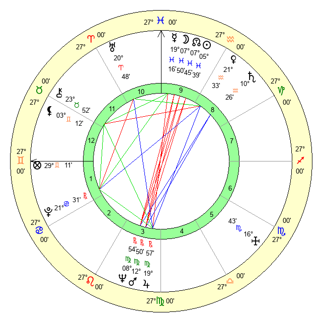 | Sun | 5 Pisces 39 | 6 Pisces 20 | 5 Gemini 56 |
