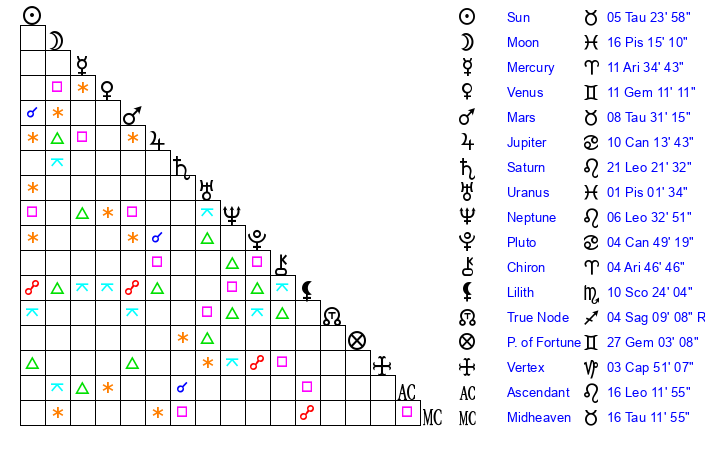 | Sun | 5 Taurus 24 | 6 Taurus 43 | 16 Leo 59 |