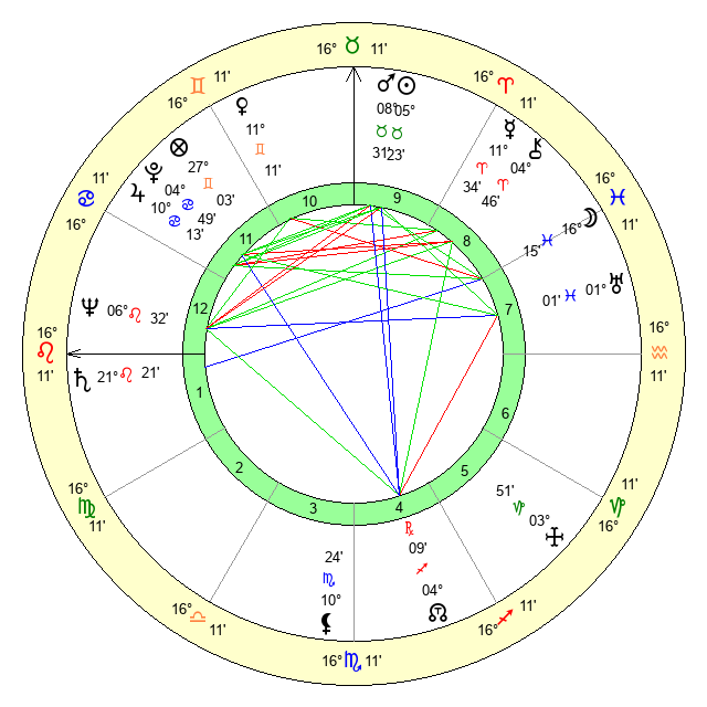 | Moon | 16 Pisces 12 | 21 Aries 2 | 4 Aquarius 25 |