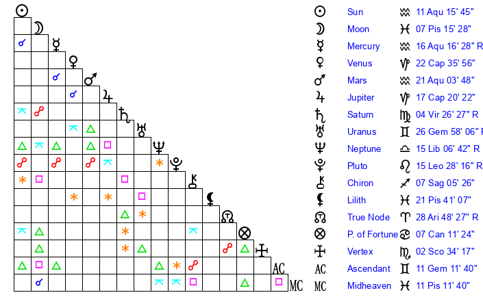 | Mercury | 16 Aquarius 15 | 5 Aquarius 29 | 1 Taurus 47 |