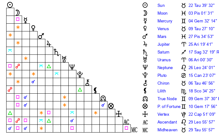 | Sun | 22 Taurus 40 | 23 Taurus 11 | 25 Leo 28 |