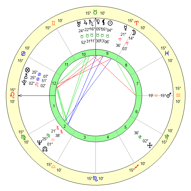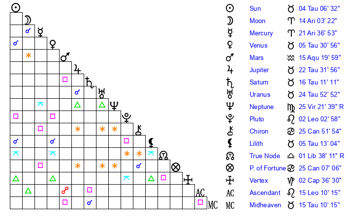 | Saturn | 16 Taurus 22 | 27 Pisces 6 | 26 Taurus 13 |