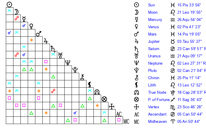 | Neptune | 2 Leo 27 | 29 Pisces 6 | 3 Leo 21 |