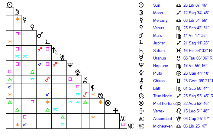 | Moon | 12 Sagittarius 39 | 6 Libra 28 | 15 Pisces 39 |