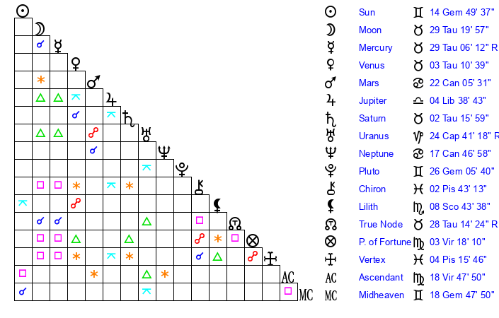 | Pluto | 26 Gemini 6 | 3 Aquarius 34 | 27 Gemini 57 |