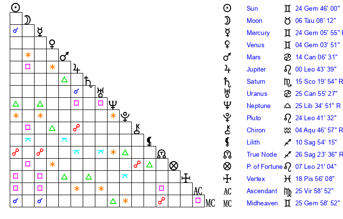| Sun | 24 Gemini 46 | 25 Gemini 48 | 1 Virgo 42 |