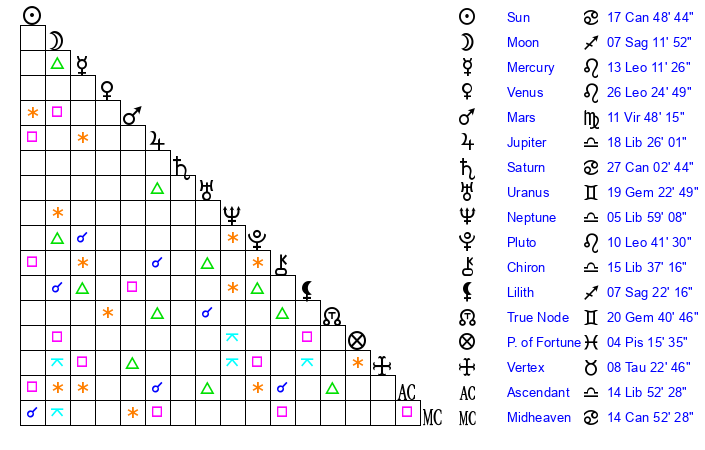 | Venus | 26 Leo 25 | 6 Gemini 44 | 18 Scorpio 27 |