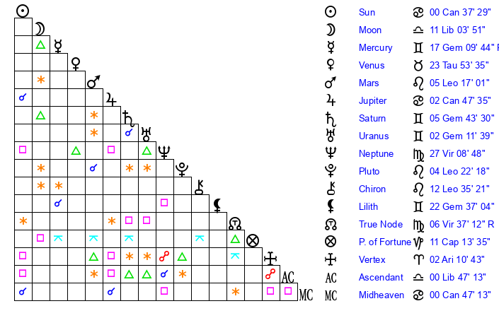 | Sun | 0 Cancer 37 | 1 Cancer 31 | 20 Virgo 16 |