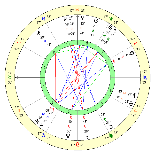 | Moon | 21 Virgo 29 | 18 Libra 25 | 11 Leo 55 |