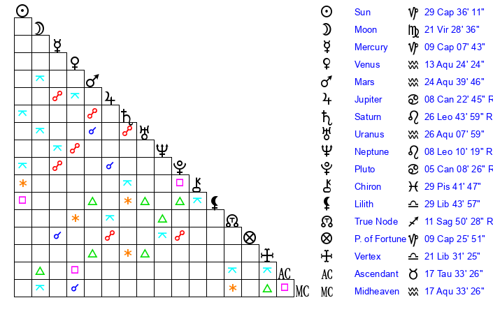 | Sun | 29 Capricorn 36 | 0 Aquarius 53 | 15 Taurus 6 |