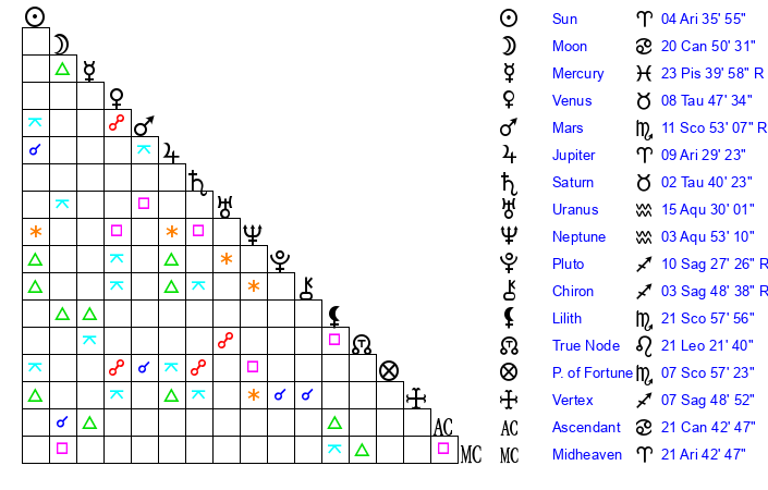 | Sun | 4 Aries 36 | 5 Aries 18 | 0 Taurus 10 |