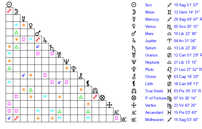 | Moon | 12 Gemini 10 | 0 Libra 27 | 25 Aquarius 45 |
