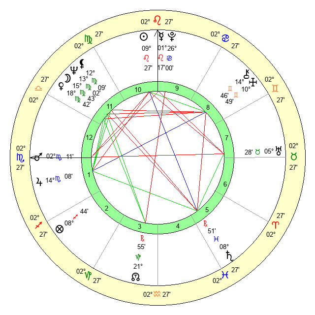 | Sun | 9 Leo 27 | 10 Leo 39 | 7 Scorpio 20 |