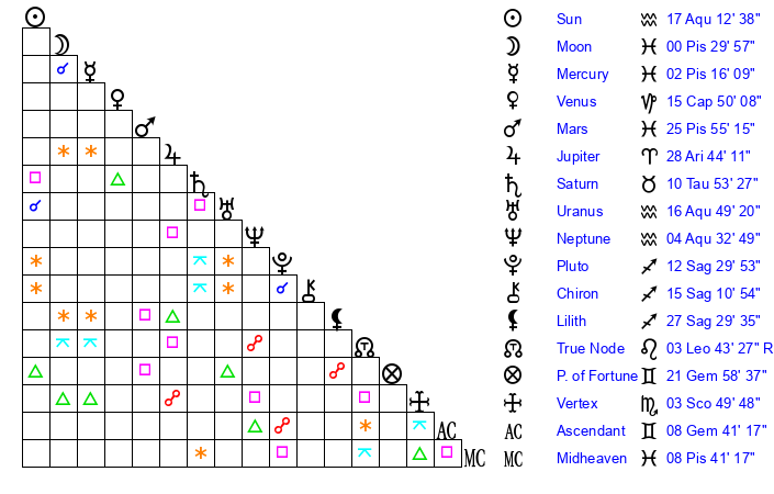 Sun | 17 Aquarius 13 | 18 Aquarius 9 | 12 Pisces 26 |