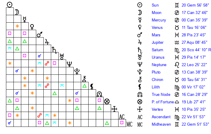 | Pluto | 13 Cancer 39 | 3 Aquarius 28 | 15 Cancer 48 |