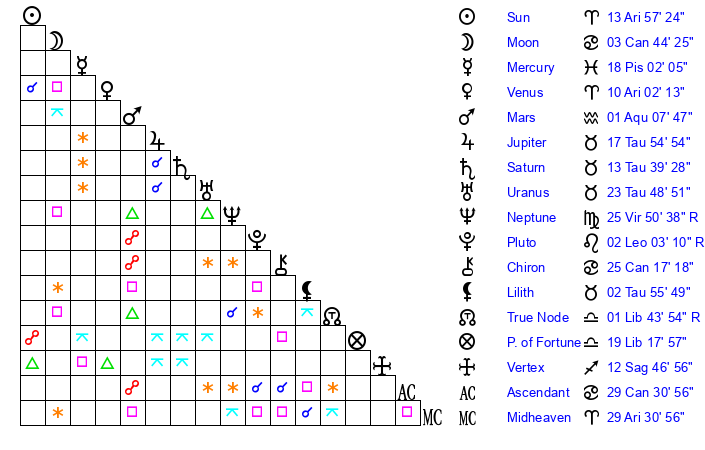 | Sun | 13 Aries 57 | 14 Aries 36 | 5 Cancer 4 |