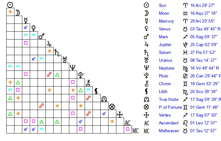 | Sun | 16 Aries 28 | 17 Aries 8 | 11 Cancer 19 |