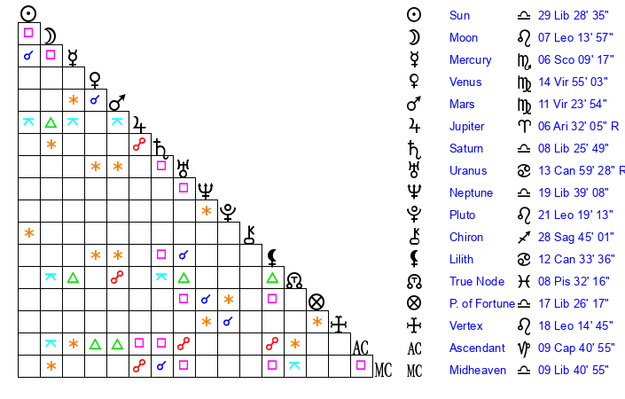 | Neptune | 19 Libra 39 | 29 Pisces 57 | 21 Libra 37 |