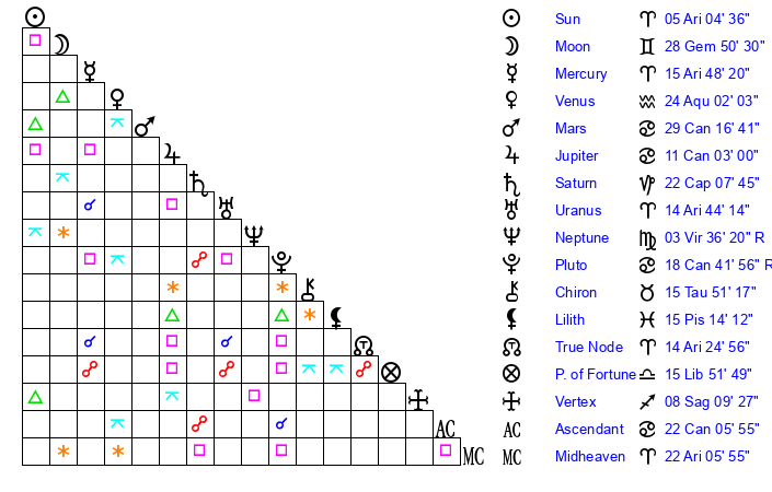 | Sun | 5 Aries 4 | 6 Aries 17 | 6 Cancer 1 |