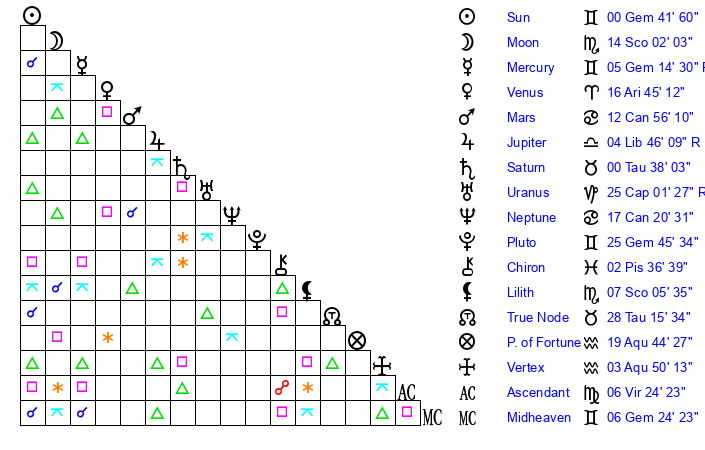 | Pluto | 25 Gemini 46 | 3 Aquarius 44 | 27 Gemini 54 |