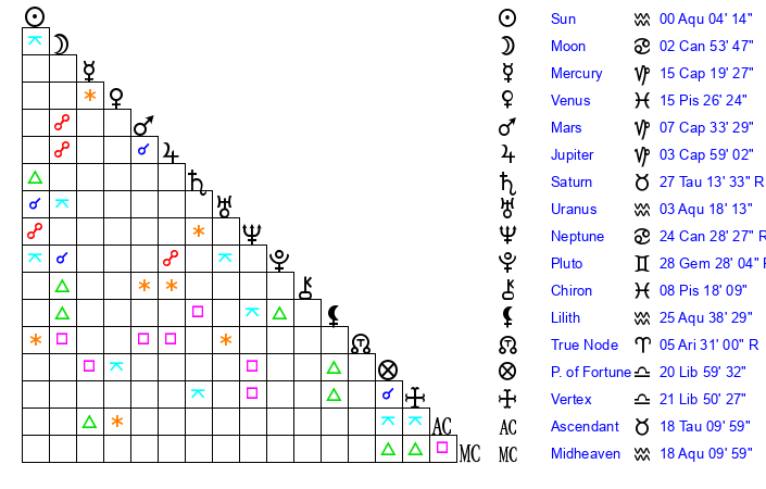 Sun | 0 Aquarius 4 | 0 Aquarius 53 | 21 Taurus 20 |