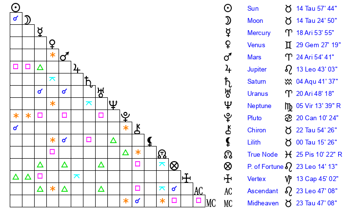 | Sun | 14 Taurus 58 | 15 Taurus 27 | 13 Leo 59 |