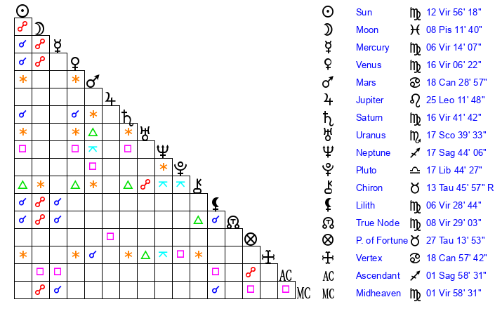 | Saturn | 17 Virgo 3 | 29 Pisces 32 | 22 Virgo 36 |