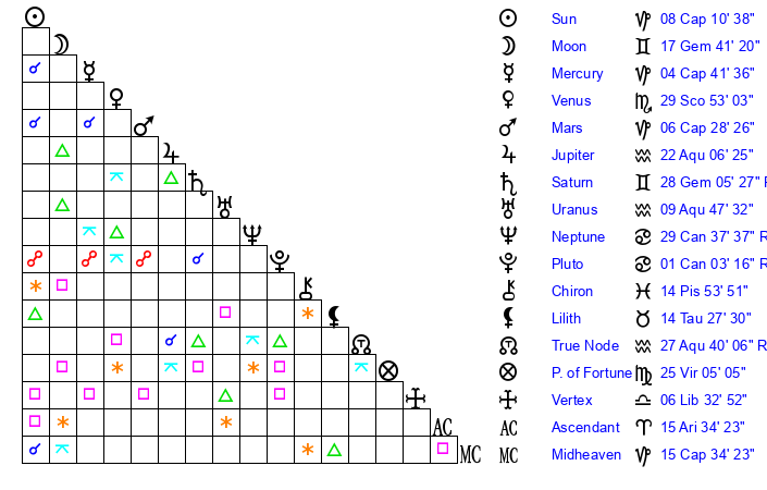 | Moon | 17 Gemini 42 | 6 Capricorn 43 | 25 Gemini 40 |