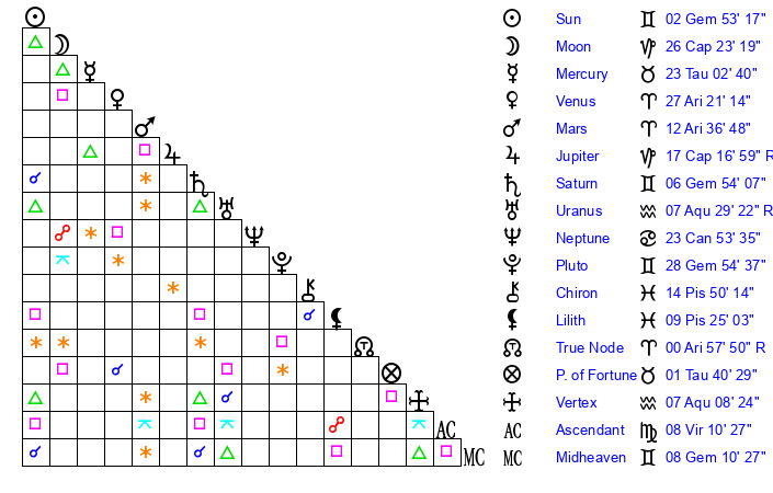 | Saturn | 7 Gemini 30 | 29 Pisces 52 | 18 Gemini 34 |
