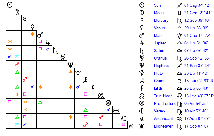 | Sun | 1 Sagittarius 34 | 1 Sagittarius 39 | 17 Capricorn 19 |