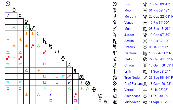 | Mercury | 23 Capricorn 21 | 10 Capricorn 38 | 11 Taurus 29 |
