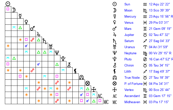| Sun | 12 Aquarius 23 | 13 Aquarius 5 | 17 Taurus 36 |