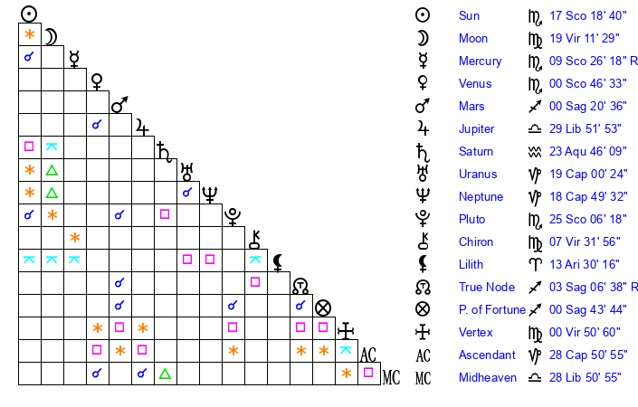 | Sun | 17 Scorpio 18 | 17 Scorpio 33 | 19 Sagittarius 40 |