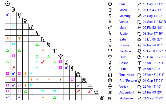| Mercury | 23 Sagittarius 16 | 7 Sagittarius 15 | 19 Pisces 2 |