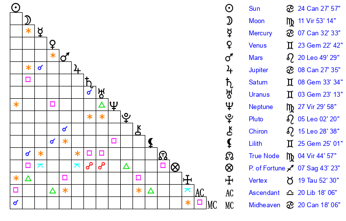 | Moon | 11 Virgo 58 | 21 Aries 6 | 26 Virgo 23 |