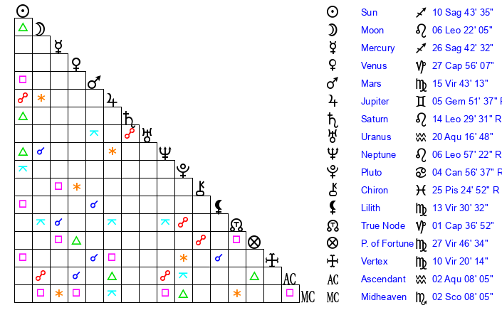 | Neptune | 6 Leo 57 | 27 Pisces 7 | 4 Leo 29 |